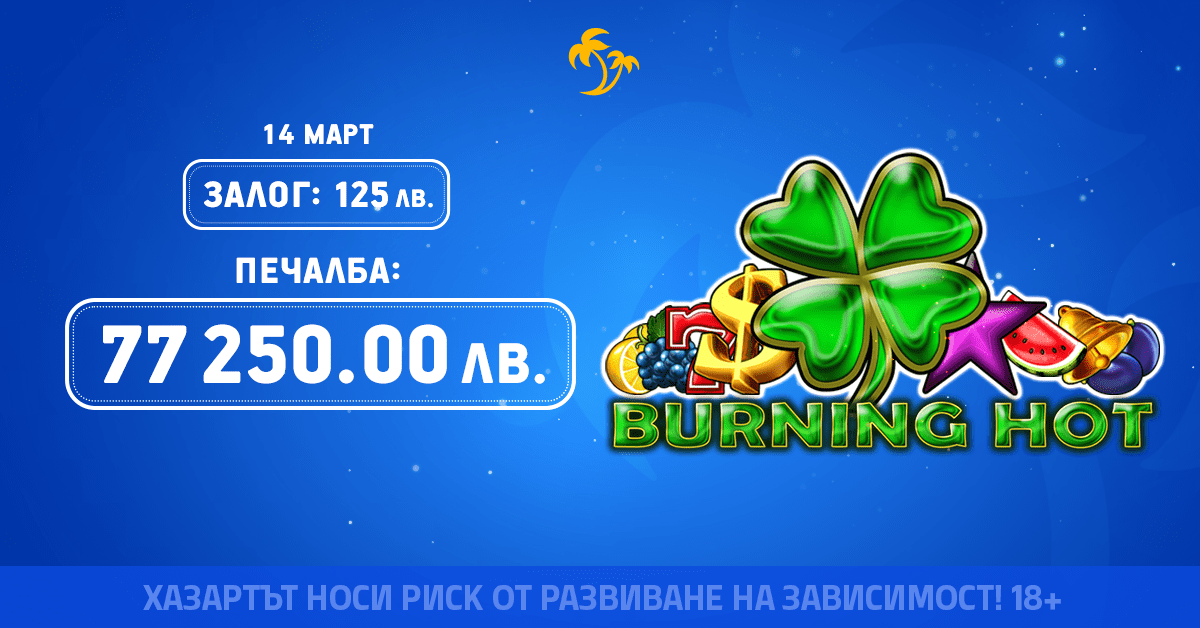 🌴 На 14 март играч в онлайн казиното на Palms Bet успя да спечели сумата от 77 250 лв. след залог от 125 лв.! Голямата печалба дойде без намесата на джакпот!