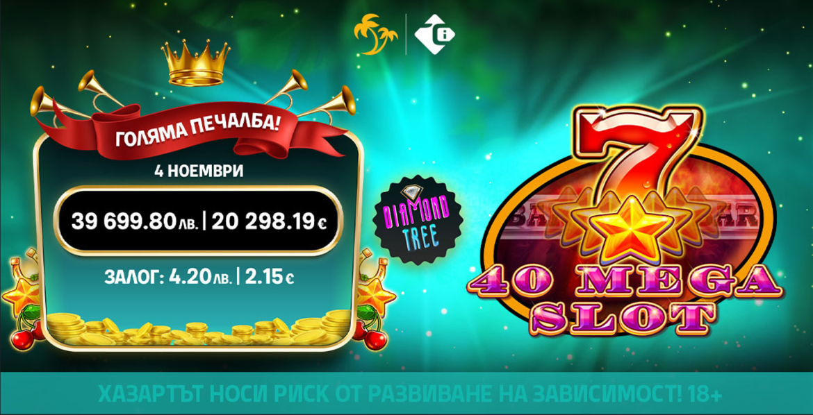 🌴 На 4 ноември в онлайн казиното на Palms Bet падна още един впечатляващ джакпот – MEGA Diamond Tree Jackpot! 💎 Късметлията спечели невероятната сума от 39 699.80 лв. със залог от едва 4.20 лв.! 🤑