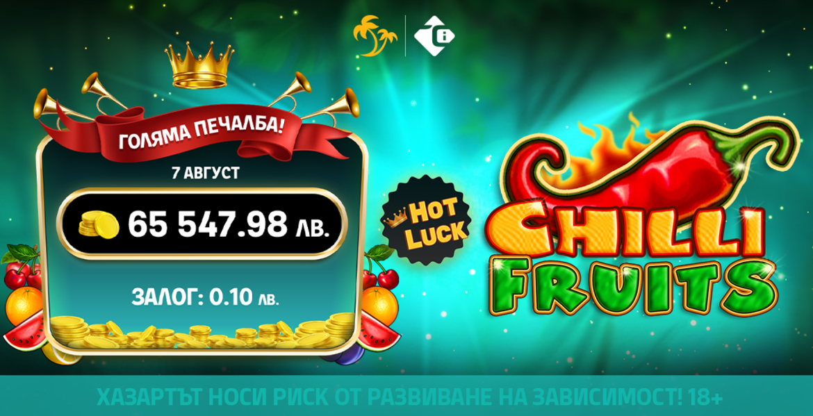 🎰 Топ печалбата падна с една от най-популярните слот игри на CT Interactive – Chilli Fruits! Класическо заглавие с плодова тематика и пикантен привкус, което обединява носталгията по добре познатите символи с възможностите на съвременния дизайн и геймплей. А както стана ясно – дори при минимален залог, вълнението и наградите са съвсем реални!