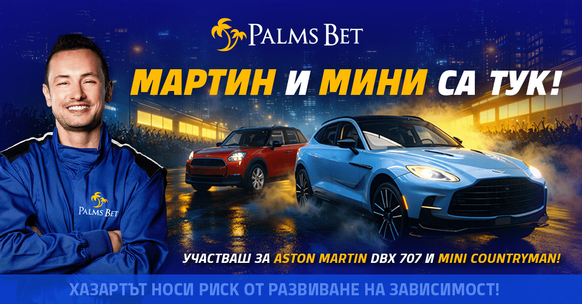 🤩 И да не забравяме – ИГРАЕШ И ЗА ДВЕТЕ! Ако в хода на кампанията си събирал участия за Mini Countryman, вдигнал си поне ниво Platinum в Palms Loyalty и си започнал да събираш участия и за Aston Martin DBX707, участваш и в двете тегления!
