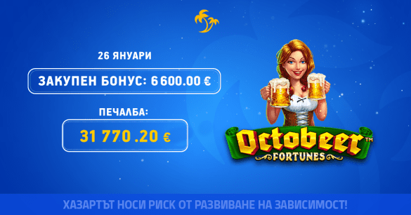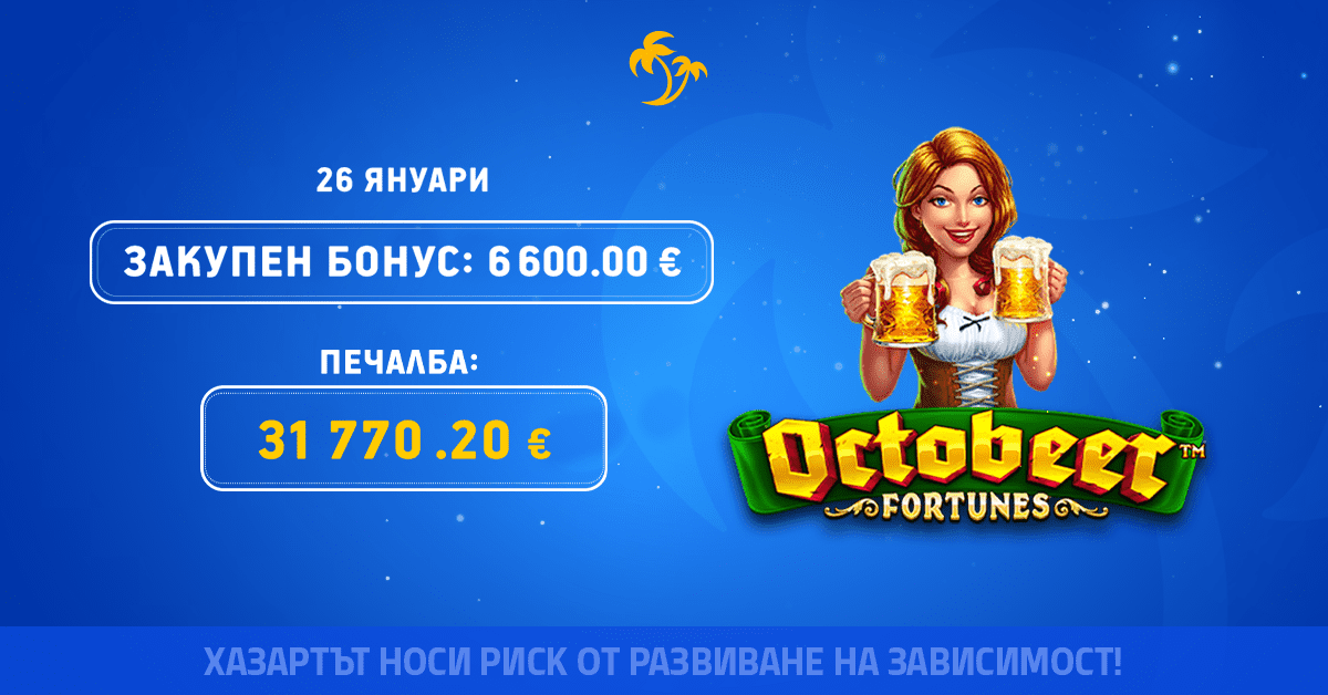 🎰 Големият удар дойде от атрактивната слот игра Octobeer Fortunes от Pragmatic Play – цветно и забавно заглавие с пивоварска тематика, богато на бонуси, множители и възможности всяко завъртане да се превърне в повод за тост! 🍻