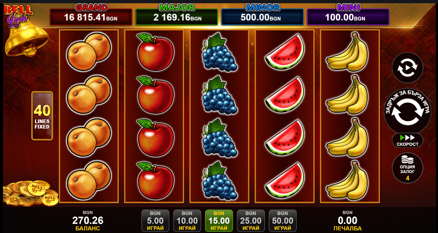 🎯 Третата джакпот печалба, при която залог от 10 лв. се превърна в 10 139.95 лв., дойде от друго добре познато заглавие от EGT Digital – 40 Lucky Kind Extreme Bell Link.